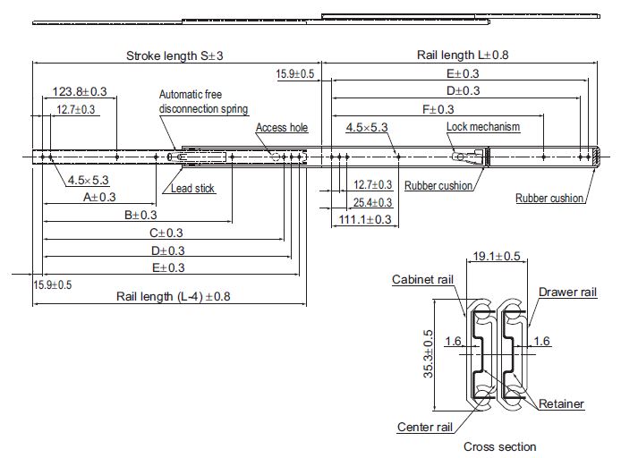 A double-slide type that combines two units of model FBL 35S front-to-front. Releasing the automatic free disconnection spring attached on the inner rail allows the inner rail to be pulled out. When folded, the locked state with the disconnect spring can automatically be released with force above a certain level in the folding direction. It is also equipped with a pull-lock mechanism that functions when the slide rail is fully extended.