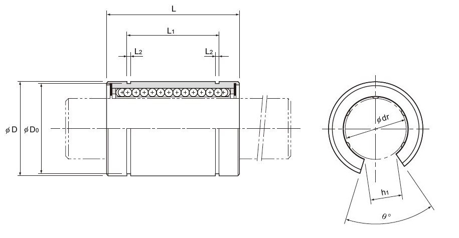 | Inscribed bore diameter | Outer diameter | Length | L1 | Tolerance | L2 | D0 | h1 | θ° | Dynamic rating C |