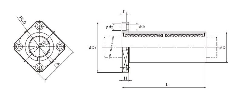 Inscribed bore diameter Outer diameter Overall length Flange diameter K H PCD Mounting holed1×d2×h Dynamic