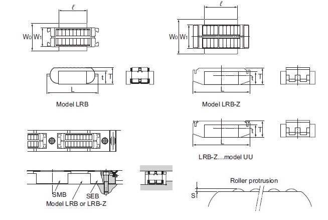 LRB: Since this model does not require a groove on the mounting surface, man-hours for machining can be reduced. It can be mounted using fixture model SMB or SEB and bolts. LRB-Z: A lighter type that uses a resin retainer and is designed to be mounted in the same manner as model LRB. Since it has a groove for installing a seal, a special rubber seal with a high contamination protection effect can easily be attached. In addition, this model is capable of high-speed traveling at 1 m/s. "