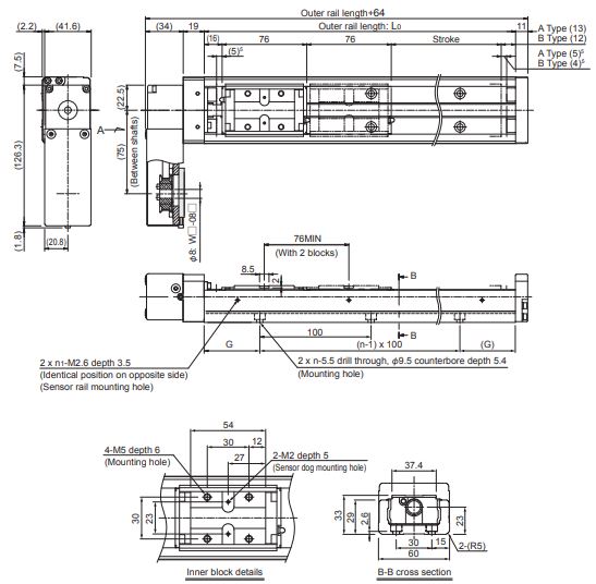 | Ball screw lead | Outer rail length L0 | G | F | H | D | Q | K | p | n | n1 | Uncovered | Covered | |||||||||||||||